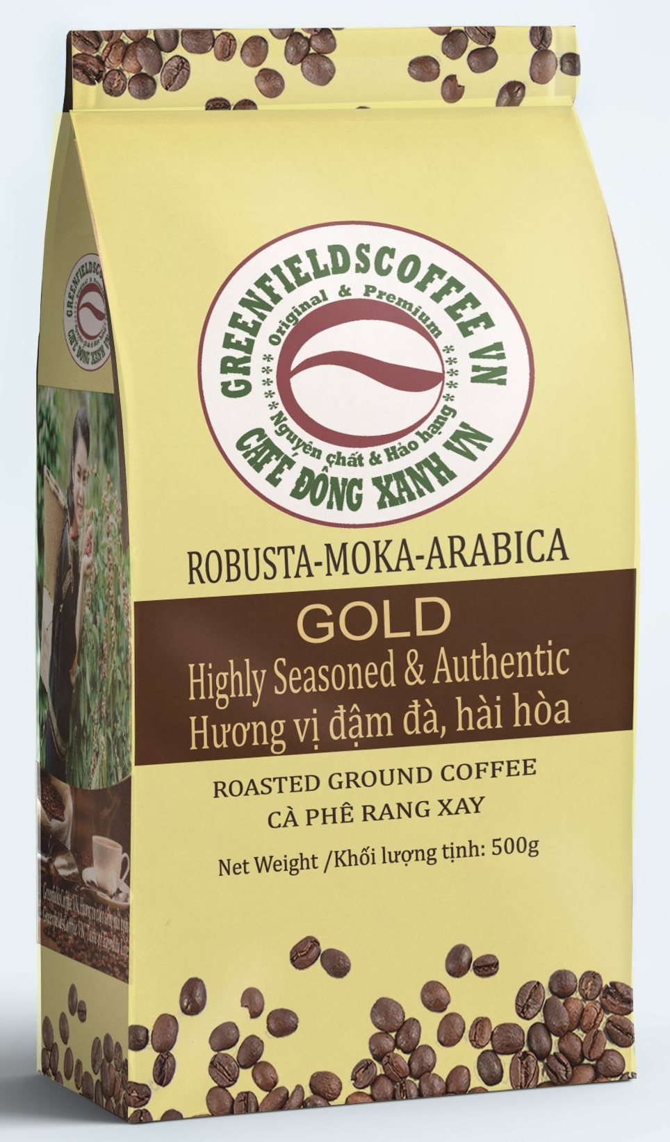 Cà phê rang xay GREENFIELDSCOFFEE-VN Roasted Ground Coffee được rang trộn từ cà phê Robusta (Cà phê vối), Arabica (cà phê chè) và Moka , được tuyển chọn từ các hạt cà phê chín đầy nông trại café hữu cơ vùng Buôn Mê Thuột và Tây Nguyên. Tỷ lệ phối trộn tạo dòng sản phẩm có hương vị đậm đà hài hòa (GOLD) và đậm đà, đặc biệt (PREMIUM) đến người tiêu dùng